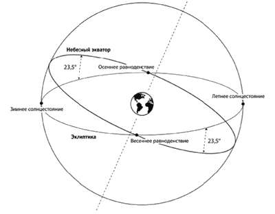 Солнце движется строго по эклиптике (ведь эклиптика и есть путь Солнца, по определению). В дни весеннего и осеннего равноденствия (около 21 марта и 22 сентября) Солнце пересекает небесный экватор, и его склонение равно нулю. В день летнего солнцестояния (около 22 июня) Солнце максимально удалено от небесного экватора к северу, и его склонение в это время максимальное северное, примерно 23,5 градуса. В день зимнего солнцестояния (около 22 декабря) Солнце максимально удалено от небесного экватора к югу, и его склонение в этот день максимальное южное, тоже около 23,5 градусов.