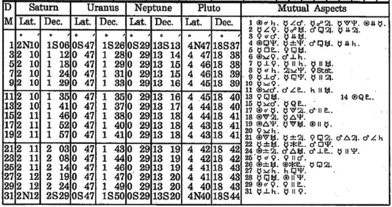 Наиболее интересна здесь табличка, озаглавленная Mutual Aspects, взаимные аспекты (рис. 43.2). Она показывает планетарные аспекты на каждый день, включая параллели. Вы видите контрпараллель Меркурия и Юпитера 2 октября, этот аспект изображается двумя перечеркнутыми параллельными линиями. 7 октября образуется параллель Меркурия к Урану – она обозначена просто двумя параллельными черточками. Здесь много разных параллелей и контрпараллелей. Точное время аспектов здесь не указано, но мы его скоро увидим в аспектарии.