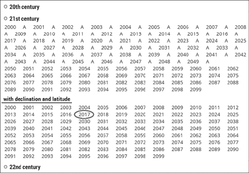 На сайте Astro.com параллели и контрпараллели планет можно увидеть в отдельной версии эфемерид. Заглянем на знакомую страничку сайта 9000 Years Ephemeris («9000 лет эфемерид»), откроем нужный нам век (21st century) и на этот раз выберем интересующий нас год в нижнем списке, который озаглавлен with declination and latitude.