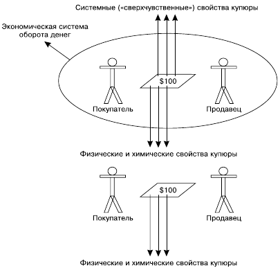 Любая действующая в тот или иной период истории денежная купюра (евро, доллар, рубль) обладает множеством физических и химических свойств. Она имеет размеры, вес, цвет, запах, горит, разрывается на части и пр. Эти свойства можно исследовать с помощью физических или химических приборов и описать, но, кроме этого, купюра обладает дополнительными свойствами, которые не могут быть обнаружены посредством органов чувств или аппаратуры. Их обеспечивает экономическая система оборота денег. Купюра в рамках этой системы является объектом, который можно обменять на определенные материальные блага, на другие купюры, товары, услуги и пр. Эти свойства не могут быть выявлены никаким физическим или химическим анализом самой купюры как материального объекта. Они проявляются в «сверхчувственной» форме, причем существуют, пока существует экономическая система, элементом которой данная купюра является. Как только в силу объективных причин экономическая система разрушается (деноминация, девальвация, революция и пр.), «сверхчувственные» свойства пропадают и купюра превращается в простой листок бумаги с рисунками, цифрами, буквами и водяными знаками. Разрушаясь сама, система уничтожает и системные свойства купюры (рис. 2).