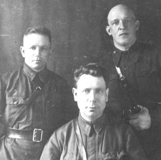 Сидит Командир Тульского рабочего полка, Герой Советского Союза майор Кравченко И.Я. Стоят: справа – нач. ПФС, воентехник 1 разряда Шкунаев Михаил Иванович, слева – помощ