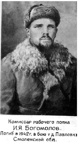 Очищая нашу священную землю от фашистской нечисти, смертью храбрых пал боевой комиссар Тульского Рабочего полка, друг, товарищ бойцов и командиров Иван Яковлевич Богомолов.