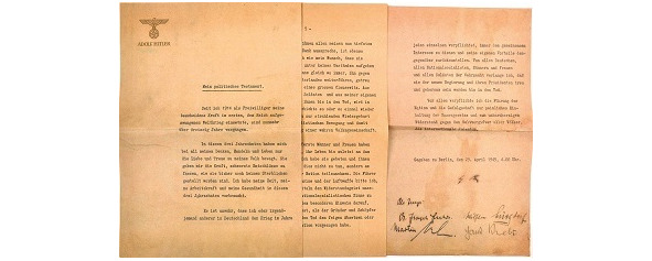 Так вот этот посланец Сатаны, Адольф сын Алоизия, каким-то чудом, излечился, словно его и правда опекал сам Дьявол. Кстати, он, ещё лечился и в психиатрическом отделении прусского тылового госпиталя. И было ему, тогда, 29 лет 5 месяцев и 25 дней, или, почти 29,5 лет. Наконец, по странному стечению обстоятельств, Гитлер в апреле 1945 года, и именно 29 числа, за день до своего самоубийства, подписал политическое завещание, в котором назначил преемником гросс-адмирала Деница. Под этим документом поставили подпись ещё 4 человека: Мартин Борман, Йозеф Геббельс, генералы Вильгельм Бургдорф и Ганс Кребс. И было это, получается, что в 4-ом месяце, в 4 часа утра. Всего же, таким образом, на данном документе было 5 подписей, включая подпись самого Гитлера.