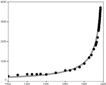 Корреляция между эмпирическими оценками долгосрочной динамики численности населения мира (в миллионах чел., 1000–1970 гг.) и кривой, генерируемой уравнением фон Фёрстера