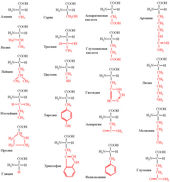 Вот, к примеру, структурные формулы основных, так называемых избранных 20-ти протеиногенных аминокислот.