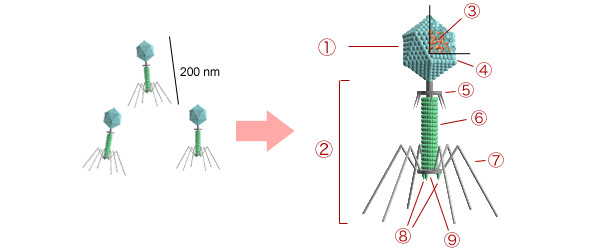 Структура вирусного бактериофага Т4: 1 – головка; 2 – хвост; 3 – нуклеиновая кислота; 4 – капсид; 5 – «воротничок»; 6 – белковый чехол хвоста; 7 – фибрилла хвоста; 8 – шипы; 9 – базальная пластинка