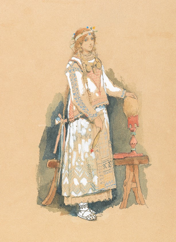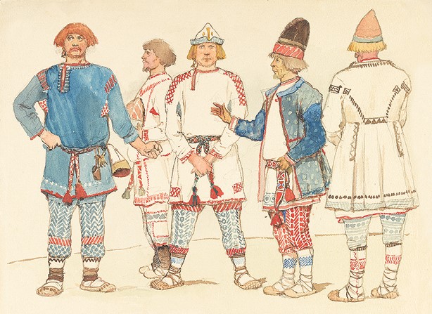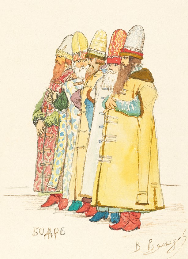 Входит Снегурочка, за ней Бобыль и Бобылиха, одетая богато, в большой рогатой кичке.