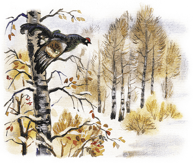 Впереди – небольшая поляна. Едва Николай Иванович выбрался туда, как вдруг прямо перед ним белым фонтаном взметнулся снег и из-под него с шумом вырвалась большая чёрная птица – одна, другая, третья… Тетерева!