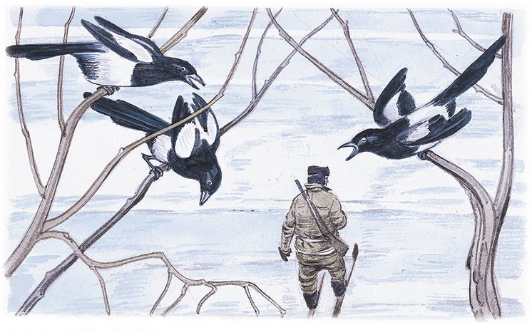Запрятав косача в заплечный мешок и покрепче завязав его, Николай Иванович внимательно осмотрел снег, где сидела птица, и сразу всё понял: тетерева, покормившись на деревьях берёзовыми почками, ещё с вечера забрались в снег, выкопав в нём глубокие норки. А за ночь снег сверху замёрз. Пробить его тетереву очень трудно, а на входное отверстие Николай Иванович наехал лыжей. Вот зазевавшийся петушок и попался в ловушку.