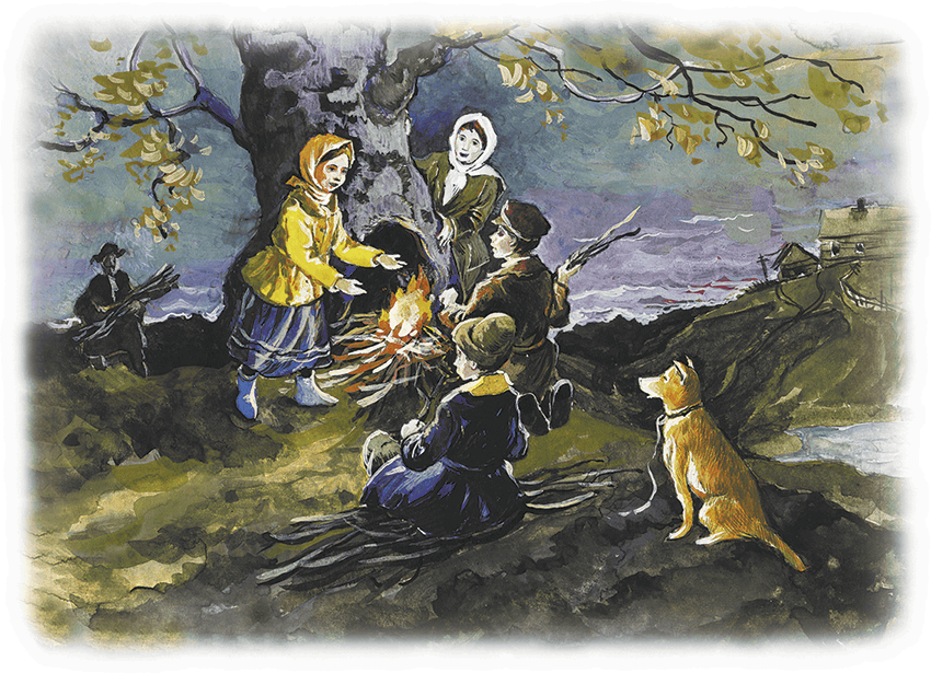 – Постойте! – кричит один мальчуган. – Тащите-ка сучья к берёзе. Вон у самых корней будто печурка, там уж костёр не задует.
