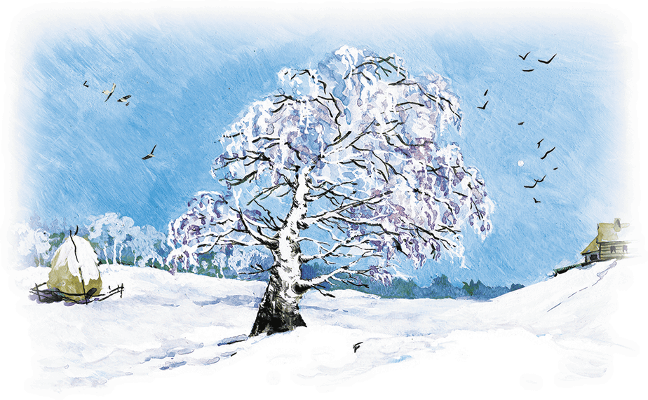 Всё кругом: и поля, и леса – засыпал снег. Посреди белого поля виднелась одна только берёза. Её ветви обледенели, покрылись инеем. И когда утром солнце вставало, берёза казалась нежно-розовой, будто нарисованной тонкой кистью на синем фоне морозного неба. Только внизу, у самых корней, по-прежнему чернела обугленная дыра. Но и она теперь не очень была заметна – снаружи её слегка припорошил снег.