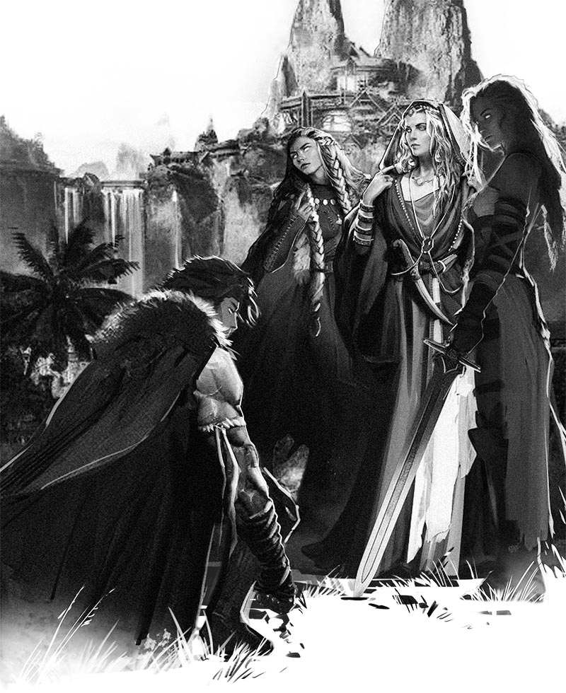 Летающие острова опустись на широкий, весь пестреющий цветами луг на берегу неглубокой, но быстрой и прозрачной реки. Там их уже встречали несколько женщин в сиреневых платьях. Бывшие пленницы (за исключением Ювилэ, которая, как и собиралась, осталась на летающем острове вместе с Маару) попрыгали на землю и бросились обниматься с подругами. Когда радость встречи, обильно сопровождаемая бессвязными восклицаниями, криками и даже слезами немного поутихла, Прай напомнил о себе и попросил отвести его к Мудрейшей.