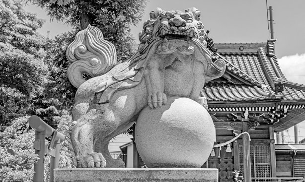 Иногда на подходе к святилищу можно встретить каменные изваяния китайских не то львов, не то собак – кома-ину. Этот заимствованный элемент попал в Японию вместе с буддизмом и, судя по всему, пришёлся местным жителям по душе: каменные скульптуры животных придавали архитектуре нездешний колорит. Они тут являются охранниками и защитниками, потому и выглядят иногда довольно грозно.
