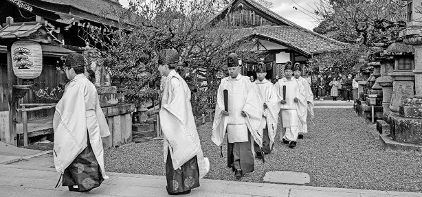 Каннуси во время молитвенной церемонии в храме Китано-Тэммангу. Киото, преф. Киото, Япония