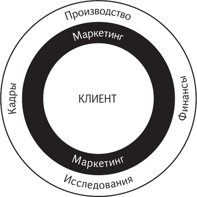 В центре такой компании находится Клиент. Промежуточным звеном между Клиентом и всеми подразделениями компании выступают маркетологи (отдел маркетинга). Маркетологов иногда называют представителями Клиента на фирме. И чем более профессионально и агрессивно маркетологи представляют интересы Клиента, тем лучше для фирмы.