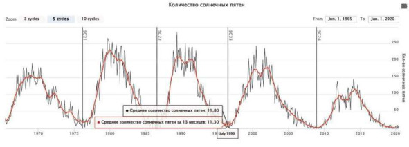 Следует иметь ввиду, что 1996 и 2019 годы приходятся на минимумы циклов солнечной активности (фото 5.2.2 циклов).