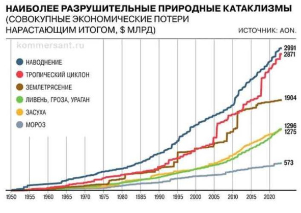 Соответственно все другие катастрофические явление, связанные с жарой, такие как ливни, ураганы, потопы, пожары, таяние льдов, а также косвенно обусловленные – землетрясения, вулканическая деятельность и многие другие проявили себя в этом году наиболее интенсивным образом. На фото 5.2.4 приведены совокупные экономические потери от природных катаклизмов по годам.