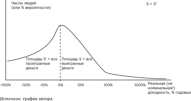 Помимо транзакционных издержек активного инвестирования, этому способствуют правила деления «призового фонда». За вычетом комиссии объем выигранного равен объему проигранного. Но правый хвост распределения, во-первых, длиннее, во-вторых, там собраны более крупные ставки (с каких бы ставок ни начинали лучшие игроки, довольно быстро их ставки станут сильно крупнее средних). Таким образом, на выигравшей стороне всегда будет меньше игроков, чем на проигравшей. Всегда. Независимо от правил игры, мастерства участников, комиссионных издержек и т. д. Это дедуктивное правило, не нуждающееся в индуктивных подтверждениях. Чтобы годами кормить одного волка c Уолл-стрит, нужно много маленьких поросят.