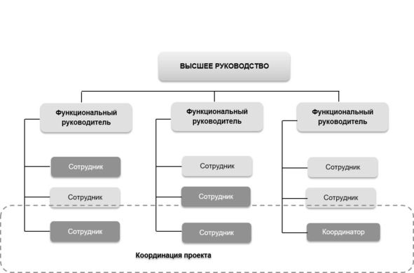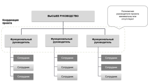 Функциональная организационная структура – это, скорее всего, именно та организационная структура, которую Вы встретите в компании, решившей внедрить с нуля проектное управление. Нет ни руководителей проектов в чистом виде, ни зачатков Проектного офиса. Конечно же, управлять проектами в такой структуре крайне сложно и малоэффективно.
