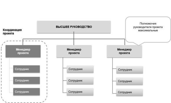 Проектная организационная структура – довольно редкий случай. Это идеальная организационная структура для работы с проектами – руководители проектов имеют в этой структуре максимальную власть и полномочия.