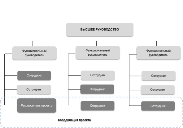 Матричная структура гораздо лучше подходит для проектной деятельности, чем функциональная, и позволяет повысить эффективность работы с проектами. Суть любой матричной организационной структуры состоит в двойном подчинении – каждый сотрудник компании, участвующий в проектах, подчиняется не только своему функциональному руководителю, но и руководителям тех проектов, в которых он задействован.