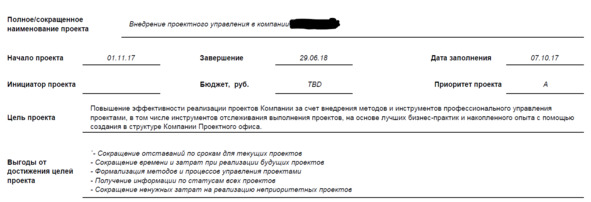 Зафиксированные в Уставе проекта цели и выгоды внедрения проектного управления в компании ****** *****