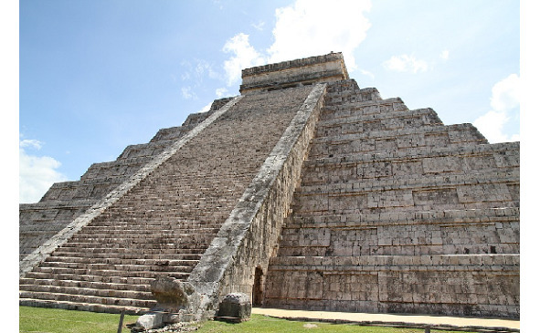 2 Пирамида в городе Чичен-Ица («Колодец Майя» или «Волшебная чаша магов»), посвящена Кукулькану («Пернатому Змею»), полуостров Юкатан. Высота вместе с храмом на вершине 30 м., длина каждой из сторон 55 м. Каждая из четырех лестниц имеет 91 ступень, их общее число равно 364. Внутри пирамиды также находится храм, с двумя помещениями и жертвенниками – алтарями. Под сооружением, на глубине 20 м. находится карстовое озеро. В настоящее время не существует знания о том, кто возвел пирамиды Мезоамерики. Майя существовали за сотни лет до ацтеков. Возраст пирамиды, согласно данным, основанным на астрономических наблюдениях (сопряженных с функцией пирамиды как календаря) составляет 10 081 г. до н.э.. В любом случае, Кукулькан не мог быть построен позже 1050 г. н.э. – даты заката цивилизации майя.