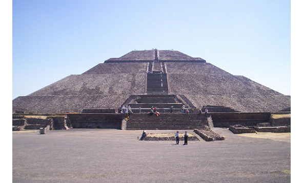 3. Пирамида Солнца, древний город Теотиуакан, 70 км. на северо-восток от Мехико. Построена, предположительно, в 100 г. н. э. На лестнице – люди; виден масштаб. Высота – 64 метра, ранее – 75 м. Объем немногим менее, чем у пирамиды Хеопса. На глубине 6 метров под основанием пирамиды находятся рукотворные пещера неизвестного предназначения и тоннель. Стороны основания 225 на 220 метров. Пирамида находится в городе майя, названном ацтеками «Теотиуакан» – «Место, где люди стали богами». При майя, в пятом веке нашей эры, число жителей города достигало 200 тысяч человек. В седьмом веке город был захвачен тольтеками, либо же оставлен жителями, после многолетней засухи. Ацтеки поселились здесь к 13 в. н.э.