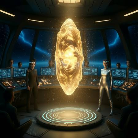 В центре рубки вспыхнуло мягкое свечение. Сначала появился полупрозрачный шар, испускающий переливчатые лучи, похожие на струи света, разрезающие тьму. Затем в пространстве раздался голос – глубокий, но при этом лишённый эмоций, словно говорил сам космос.