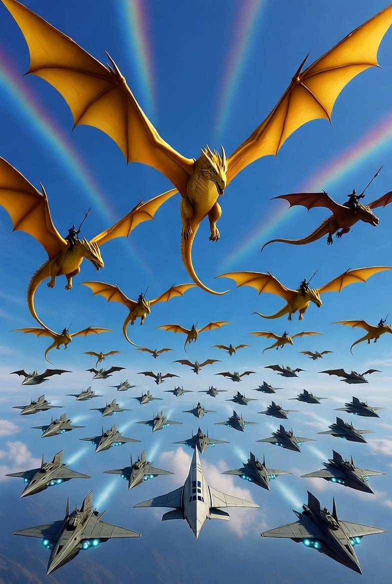 А выше, на фоне ослепительной лазури неба, плавно взмахивая огромными крыльями, парили золотые драконы. Их чешуя отливала живым металлом в лучах солнца, а размах крыльев некоторых исполинов был сравним с небольшим кораблем. На их спинах, в специальных седлах, сидели всадники в латах цвета воронёной стали, держащие длинные копья, наконечники которых источали сконцентрированную магию. Они не просто летели – они выполняли сложный, почти ритуальный танец, пересекая траектории друг друга и оставляя в небе радужные следы. Воздух гудел от могучего биения их крыльев, смешиваясь с гудением двигателей, создавая подавляющую, первобытную симфонию силы.