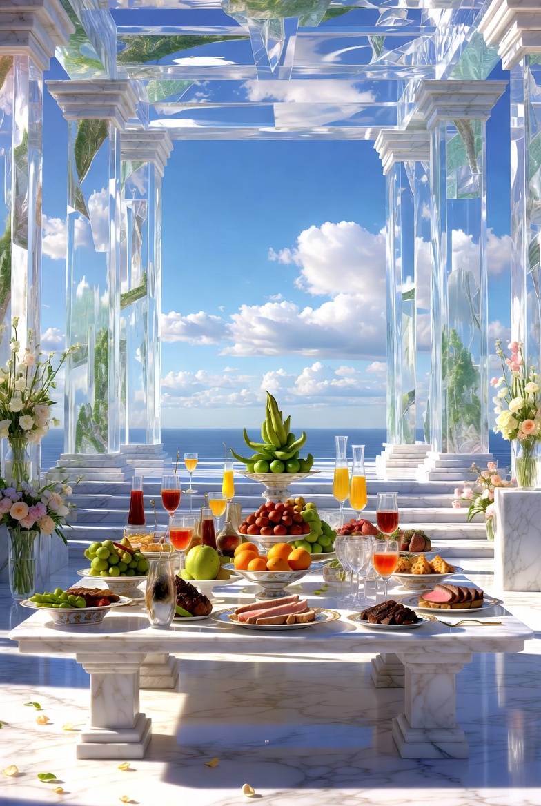 Малый Светлый Зал считался одним из красивейших помещений дворца. Стены из прозрачного хрусталя открывали виды на утреннее небо, стол из белоснежного мрамора был украшен изысканными угощениями – экзотическими фруктами дальних земель, мясом морских чудовищ, вином из слез звёзд. Воздух наполняли ароматы свежесобранных цветов и нежнейших благовоний.
