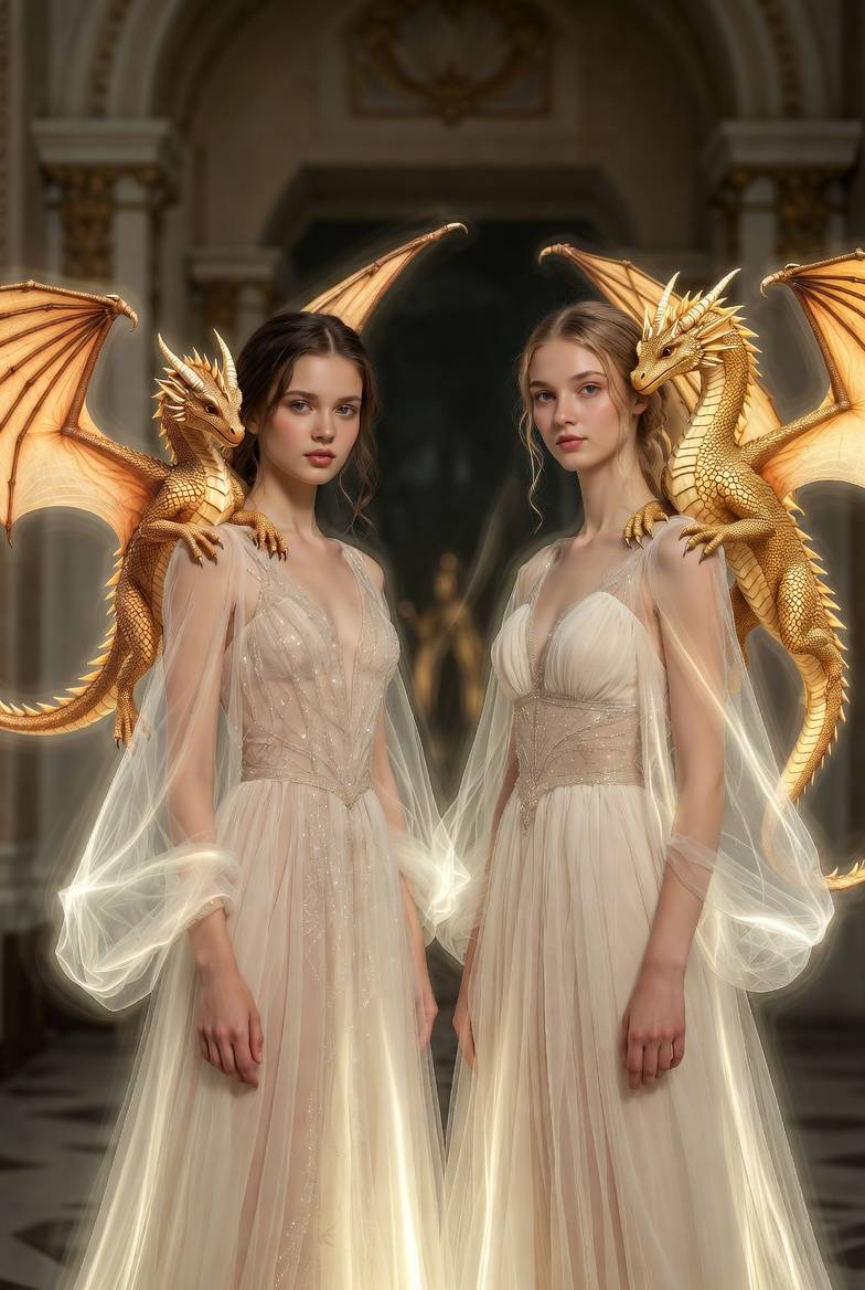 Ирина и Лея уже были готовы – в парадных одеждах, с легкой защитой под тканями, артефакты закреплены, ауры синхронизированы. На их плечах уютно устроились дракончики – Фиарн у Ирины и Киран у Леи, миниатюрные золотые создания с мягкой переливающейся чешуей, похожие на декоративные аксессуары, гармонично дополнявшие их наряды. Оба понимали: это их последняя мера безопасности, рекомендованная Роном. В экстренной ситуации драконов можно было мгновенно увеличить и покинуть замок независимо от обстоятельств.