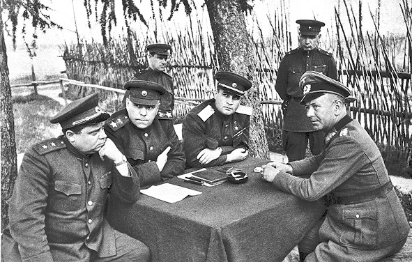 Член Военного совета 3-го Белорусского фронта В. Е. Макаров, А. М. Василевский и И. Д. Черняховский допрашивают командира 206-й пехотной дивизии А. Хиттера.