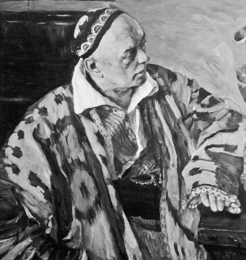 Писать меня он хотел давно, приходил с альбомчиками в 40-м году, выбирал позы, зарисовывал, но все это его не удовлетворяло. Ему хотелось чего-то простого, жизненного, хотелось написать мой смех в разговоре, который иногда ему нравился, но он все боялся, что сил ему не хватит и он не справится. Как-то раз, перебирая в ящике разные вещи, я наткнулся на два бухарских халата, которые купил в Самарканде в 1896 году во время работы над обмерами ворот мавзолея Тимура, которые я исполнял по поручению Археологической комиссии. Халаты в то время были новенькие, ярких цветов – бухарский пестрый в крупных ярких пятнах и другой, желтый в мелких черных полосках, из крученого гиссарского шелка. При них черная тюбетейка в тонких белых разводах. Зная, что М.В. любит красочные восточные вещи, я решил показать ему и мои халаты. М.В. пришел от них в полный восторг, попросил меня накинуть их на себя, полюбовался, что-то про себя подумал и сказал, что будет писать с меня портрет в этих халатах – с утра, когда я, напившись утреннего кофе, беседую у себя в кабинете, а он меня слушает и работает. Позу он дал мне простую и лицо в профиль, так как боялся, что с фасом не справится, сил мало.