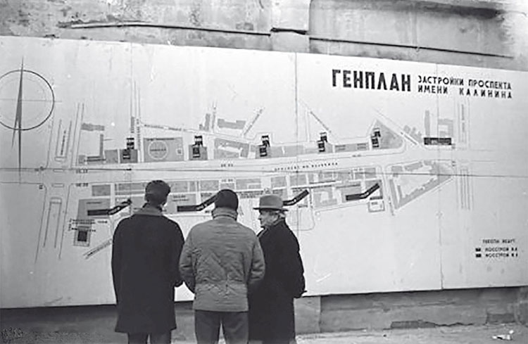 Об информационной «поддержке» будущего проспекта и массовой агитации среди населения, которая осуществлялась со страниц газет и экранов телевизоров, вспоминает фотохудожник Екатерина Рождественская: «Строительство Калининского проспекта вызывало слишком много споров… Выходили передачи по телевидению, в которых важные дяди рассказывали, что новый проспект с небоскребами – уникальный и таких в мире нет, строители и инженеры гордились особо прочными стальными каркасами, которые применялись при возведении этих высотных зданий, архитекторы – удобной и продуманной планировкой жилых квартир, художники – передовым оформлением магазинных площадей, озеленители – новым способом рулонной укладки газона, в общем, кто чем. Но все вместе – Калининским проспектом. Все усилия были направлены на то, чтобы притушить недовольство общественности и всколыхнуть гордость за Советскую страну, за ударников коммунистического труда, которые всегда в первых рядах, за единственно правильный путь – путь к светлому будущему, то есть к коммунизму». Я бы даже немного усилил – не «притушить», а придушить недовольство общественности. Вероятно, Новый Арбат также должен был привести к коммунизму – пока еще не для всех, а только для советской номенклатуры…