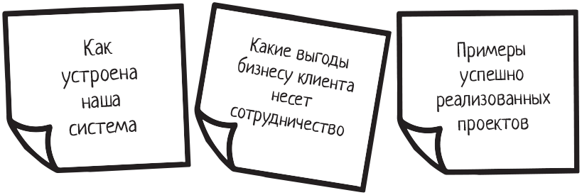 Далее спикер переходит к созданию плана. Он берет стикеры и на каждом пишет то, о чем хотел бы рассказать потенциальным клиентам. Замечу: весьма полезно бывает отталкиваться не только от того, что вы хотите рассказать, но и от того, что аудитория хотела бы услышать. Итак, перед нами три блока презентации.