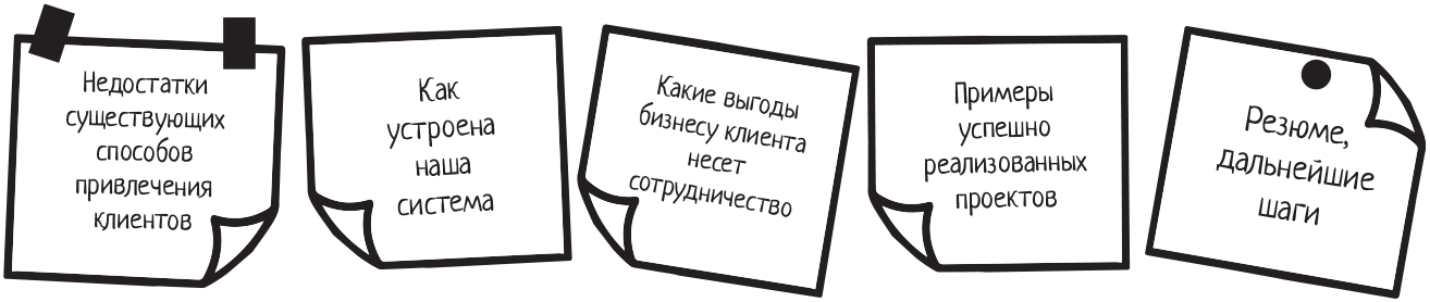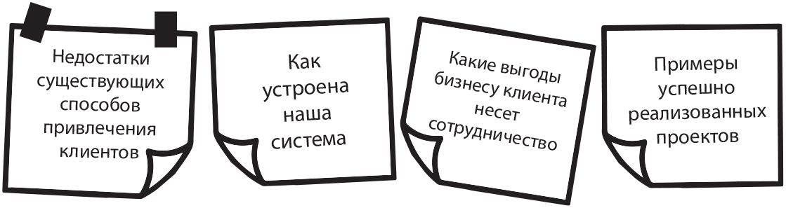 Почему аудитории было бы полезно послушать эту презентацию? Ответ на данный вопрос позволит спикеру сформулировать фразы для вступления. Он берет еще один стикер (лучше другого цвета), на котором пишет: «Недостатки существующих способов привлечения клиентов».