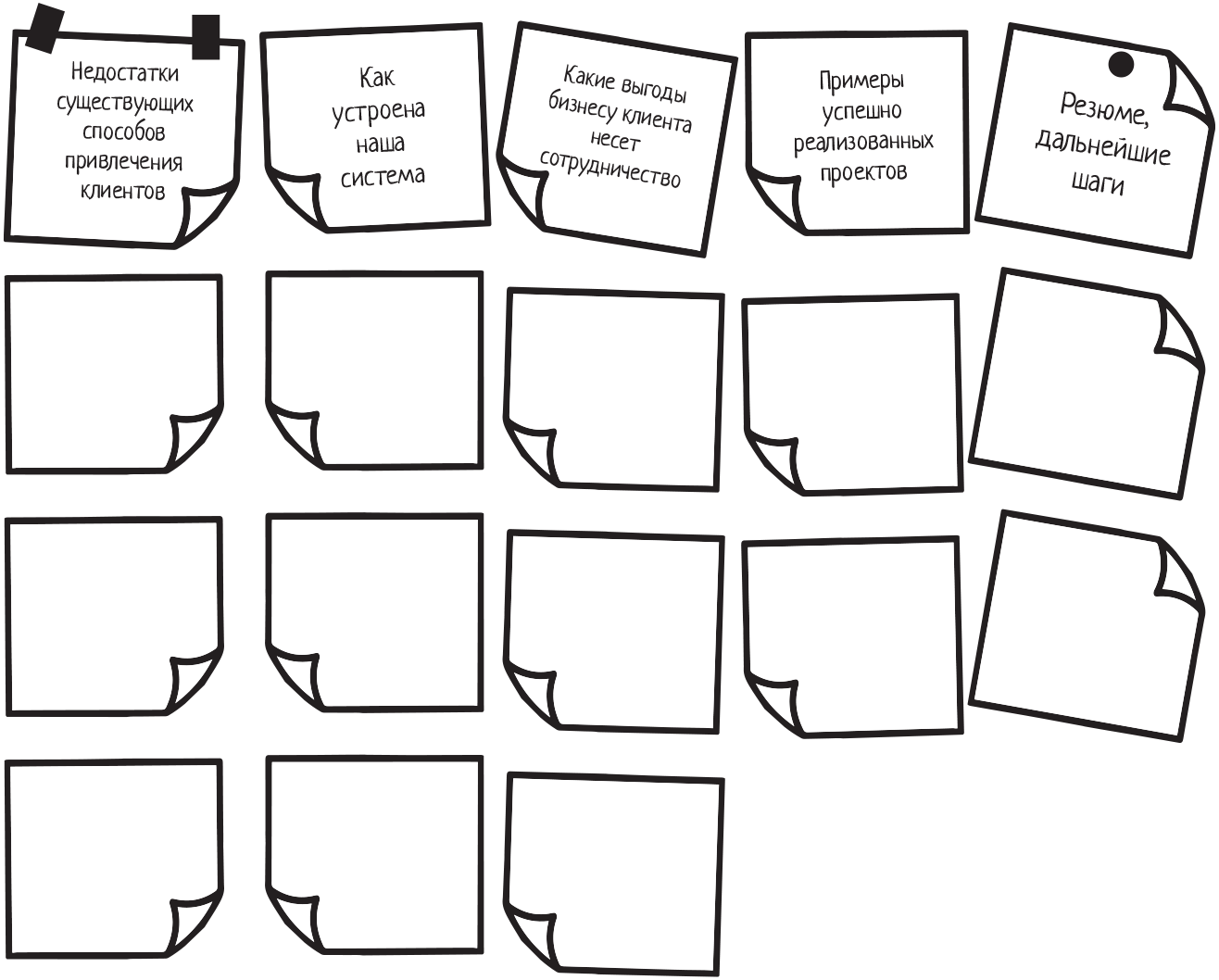 На этом шаге я обычно прошу спикера ответить на вопрос «О чем вы хотите рассказать?». Или прошу продолжить фразу от первого лица: «В презентации по этой теме я расскажу о…», – а затем беру стикеры и на каждом фиксирую краткий вариант ответной фразы. Обратите внимание: я не прошу пересказывать презентацию. Моя задача – записать на стикере только опорные мысли или название смыслового блока, который будет раскрывать заявленную тему.