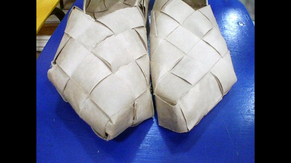 Бумажные заплетёнки лаптей для наших занятий это гениальное изобретение. Крестьян, как говорится. Мы берём бумагу. Нарезаем её на полоски длиной 1200 миллиметров и шириной 25 миллиметров. Ну, чтоб они были покрепче и не такие слабенькие. Из этих ленточек я заплетаю лапаточки. Самые элементарные, самые простенькие для того, чтобы дети могли это освоить и Не доплетён до конца, это и предстоит деткам доплести, он уже как бы наполовину готовый, лапаточек заплетённый. Но его нужно своими руками доплести до конца, в шахматном порядке брать вот эти бумажные ленточки и вот так вот проплетать по своей строчке до логического конца, если ленточки встречаются, её на 90 градусов 1 ленточку. Можем загнуть и проплести в другую строчку. Встречную ленточку вплетаем в строку встречной ленточки как бы 2 слоем. Итак, двигаемся вперёд и набираемся опыту. Это очень хороший такой Приёмчик тренажёрчик для наших юных мастеров!