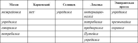 Этот тип универбатов в эмигрантской прессе представлен производными, уже существовавшими в дореволюционном русском языке. В речи эмигрантов они оставались в употреблении, в то время как в советском быту они перешли в разряд историзмов. Эмигранты же использовали их в номинативной функции, продолжая именовать старыми лексемами новые реалии: и НКВД, пришедший на смену ВЧК (чрезвычайка), и новый для эмигрантов орган государственного управления в СССР – Верховный совет (учредилка; по семантической модели функционального переноса). Иными словами: при смене социальных явлений чуждой им действительности эмигранты не видели необходимости в смене языковых номинаций, ориентируясь на функциональный аспект именования, но не внешний, социально-прагматический. См. примеры из эмигрантской прессы: