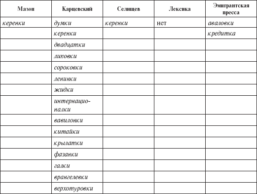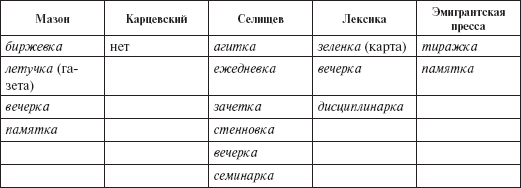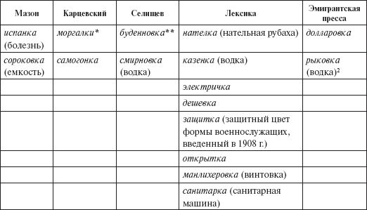 [Закрыть] (использовано, например, Чеховым), в городском просторечии – презрительно-ироническое кварташка «квартальный надзиратель» (встречается у Достоевского). В. А. Гиляровский в цикле репортажных очерков «Москва и москвичи», повествуя о Москве 80–90-х гг. XIX в., приводит, в частности, следующие примеры: толкучка «толкучий рынок», обжорка – «обжорный ряд (место торговли пищевыми продуктами)», меблирашки – «меблированные комнаты», Хитровка – «Хитров рынок». Увеличение разговорных производных на – к(а) в речи разных социальных групп свидетельствовало об укреплении данной модели словообразования в некодифицированном языке. Сопоставим списки производных в [Mazon 1920; Карцевский 2000; Селищев 1928; Лексика 1981] и эмигрантской прессе, чтобы увидеть, какие семантические типы универбатов на – к(а) были популярны в языке той поры и есть ли различия в использовании производных на – к(а) в эмигрантских текстах и русском послереволюционном языке.