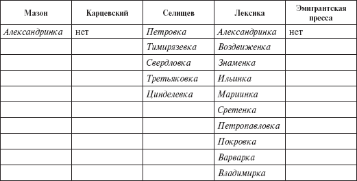 В русском языке дореволюционной поры образования на – к(а) от названий улиц чаще всего возникали в московском городском обиходе, нежели в петербургском. Ср. характерное признание А. Г. Горнфельда: «Мариинка нас возмущает, Александринка коробит меньше, к предварилке мы привыкли, а московские улицы – Варварка, Ильинка, Лубянка и даже – столь неуважительно – Покровка, Сретенка, Воздвиженка кажутся нам просто незаменимыми. В Москве Знаменка и Владимирка естественны, но дурным тоном показалось бы нам, если бы так назвали в Петербурге Знаменскую или Владимирскую…» [Горнфельд 1922 – цит. по: Лексика 1981: 190–191]. Эта цитата красноречиво показывает и психолингвистические оценки, прагматические коннотации вокруг разных типов универбатов: более приемлемыми, в частности для Горнфельда, оказываются производные от названий улиц (ввиду частотности их использования в языке), названия же театров с трудом поддавались такому способу словопроизводства (вследствие некоторой уникальности, «неповседневности» данных денотатов; ср. также приведенное выше мнение К. И. Чуковского о названиях типа МХАТ, Литфонд). В эмигрантской прессе нам не удалось обнаружить словообразовательных инноваций на базе иноязычных названий улиц, что объясняется отсутствием мотивирующего комплекса «прилагательное (с названием улицы) + улица». Также нам не встретилось в эмигрантских газетах ни одного производного, образованного от собственного названия театра, учебного заведения, завода. Не отмечают таких разговорных производных и авторы монографий [ЯРЗ 2001; ЯРЗ 2001]. Можно предположить, что эта словообразовательная модель, конечно, знакомая беженцам первой волны еще по жизни в России, оказалась в иноязычных условиях невостребованной.