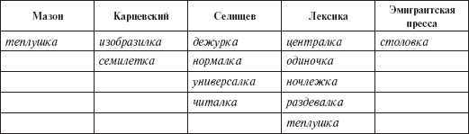 [Закрыть] эмиграции той поры. Выскажем предположение, что этот способ семантического сжатия словосочетаний остался в языке эмигрантов первой волны периферийным в словообразовательном отношении и гораздо менее развитым, чем в послереволюционном (советском) языке. К аналогичным наблюдениям пришла и Л. М. Грановская: «показателен и процесс отчуждения ряда новообразований, например, на – к(а), осознаваемых как вульгаризмы: дежурка, читалка, раздевалка, столовка» [Грановская 1995: 89].