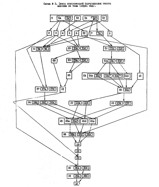 [Закрыть] длиннющая схема (включавшая 32 стадии последовательного развертывания темы) была воспроизведена полностью, заняв два страничных разворота, но при перепечатке статьи в солидном академическом сборнике («под черепашкой» – по приглашению незабвенного Григория Львовича Пермякова)[4]4