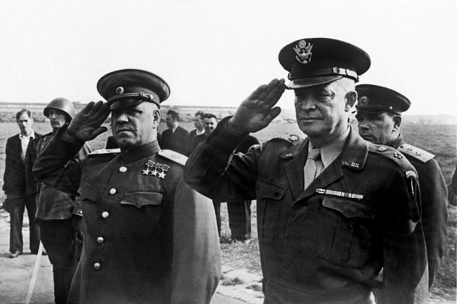 Маршал Георгий Константинович Жуков (слева) и генерал армии Дуайт Дэвид Эйзенхауэр во время исполнения национальных гимнов СССР и США на церемонии встречи Эйзенхауэра в Москве. 11 августа 1945 г.