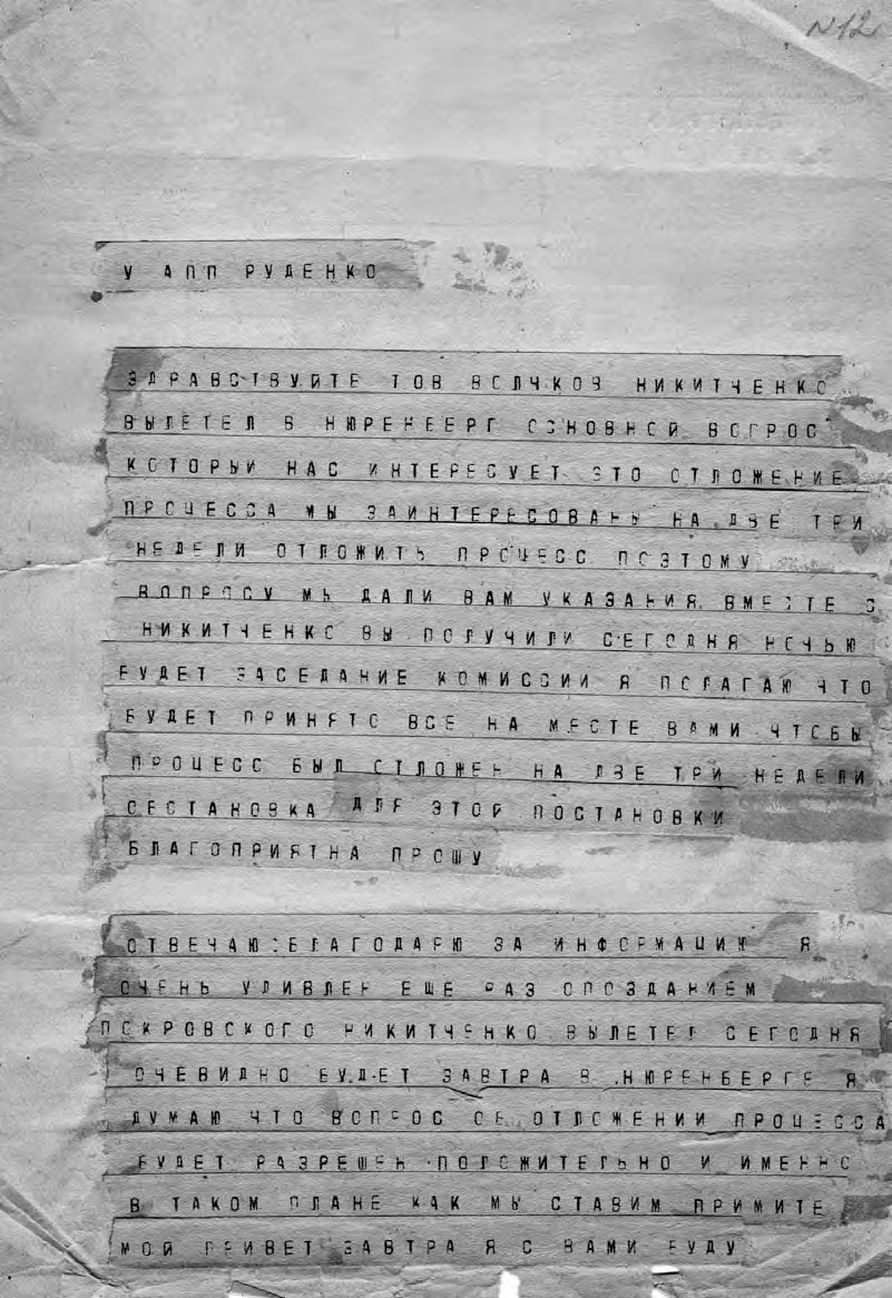 Обмен телеграммами между Р. А. Руденко и Ю. В. Покровским показывает, что советская сторона хотела ненадолго – на две-три недели – отложить открытие процесса. Покровскому, видимо, по неведению выступившему в печати против переноса срока, было высказано неудовольствие московских инстанций. Руденко, находясь в Москве, просил своего заместителя пока действовать через союзников: «…поддерживайте активно Джексона в вопросе отложения процесса». Усилия Покровского дали плоды: с переносом срока согласилась французская делегация. Однако Главного обвинителя от США Джексона «обработать» не удалось. Благо, до конфликта не дошло – советская сторона успела решить все проблемы.