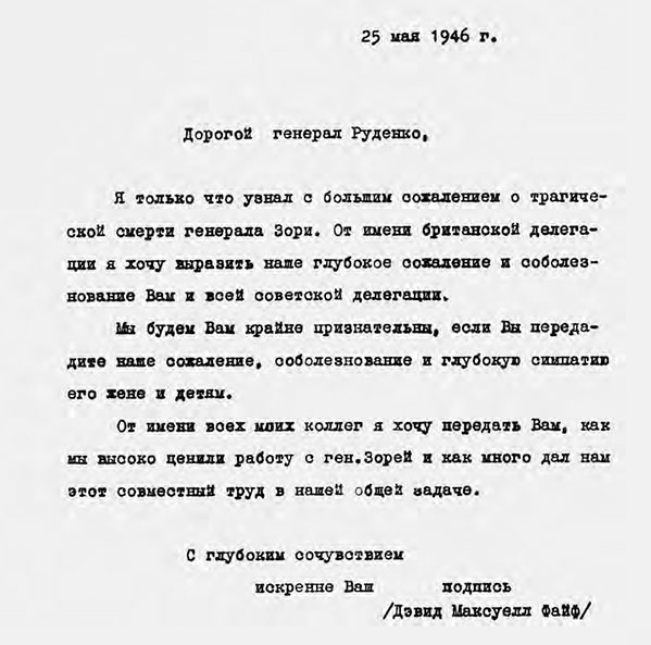 Записка Дэвида Максвелла Файфа генералу Р. А. Руденко с соболезнованием по поводу трагической гибели Н. Д. Зори, машинописный перевод (публикуется впервые)