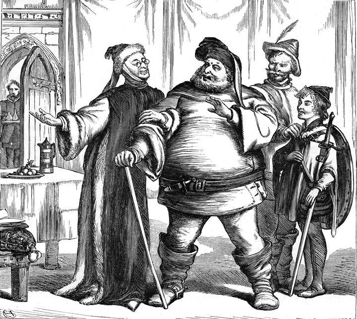 – Ага, теперь вам придется наступить на горло своему правосознанию и угождать Фальстафу, этому жуткому типу, которого наш брат не даст в обиду, – подхватывает Томас Кларенс.