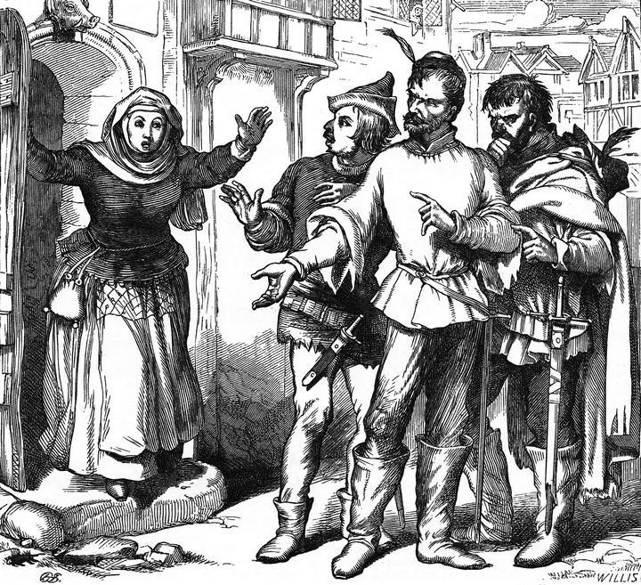 Хозяйка трактира – это та самая миссис Нелль Куикли, на которой раньше обещал жениться сам Фальстаф. Ветреная, оказывается, дамочка, хоть и немолодая, после Фальстафа крутила с Нимом, а теперь замужем за Пистолем. Организовала себе мужа в конце концов.