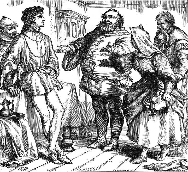 Когда входит хозяйка трактира, Фальстаф требует от нее ответа: кто обчистил его карманы? Вы ведь помните, что после ухода шерифа принц Генрих в компании с Пето собственноручно обшарил карманы крепко дрыхнувшего Фальстафа и не обнаружил там ничего, кроме счетов из трактира. Хозяйка натурально клянется и божится, что у нее приличное заведение и ни у кого ни разу ничего не пропадало. Фальстаф же настаивает на том, что у него украли нечто посущественнее ничтожных бумажек, а именно: дедовский перстень с печатью, который стоит сорок марок. Начинается злобная перебранка, в ходе которой хозяйка припоминает Фальстафу его долги перед ней: она, дескать, купила сэру Джону дюжину рубашек, а он, неблагодарный, теперь затевает ссору, чтобы увильнуть от расплаты. Кроме того, он задолжал за еду и питье, а еще взял у хозяйки взаймы двадцать четыре фунта. Фальстаф сам факт долгов не опровергает, но платить все равно не хочет и прямо на ходу выдумывает отговорки, звучащие глупо и неубедительно. Мало ли, сколько он должен, если у него пропал дорогущий перстень! Хозяйка в ответ возражает, что перстень был медный, а не из драгметалла, ей об этом, мол, сказал сам принц. Фальстаф возмущен и обзывает принца Генриха болваном и прохвостом, а заодно грозится избить клеветника, как собаку.